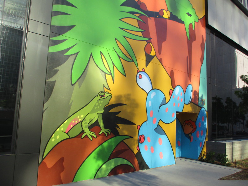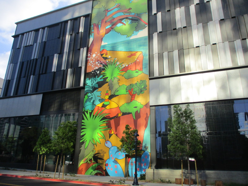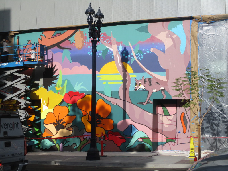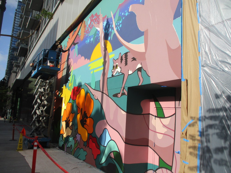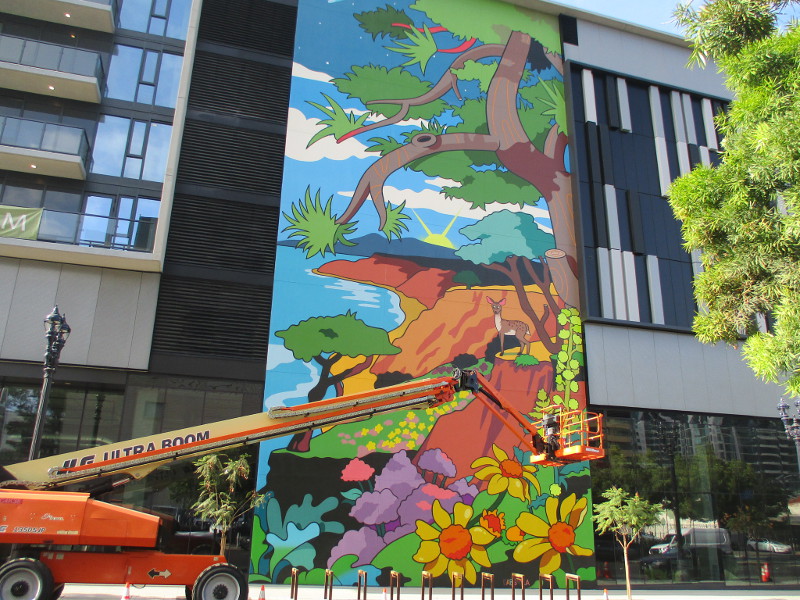 Huge, super colorful murals are being painted in downtown San Diego. Once completed, there will be four murals, one on each side of The Torrey’s new high-rise. The Torrey is located at 1200 Front Street, where the north part of the old downtown courthouse used to stand.
