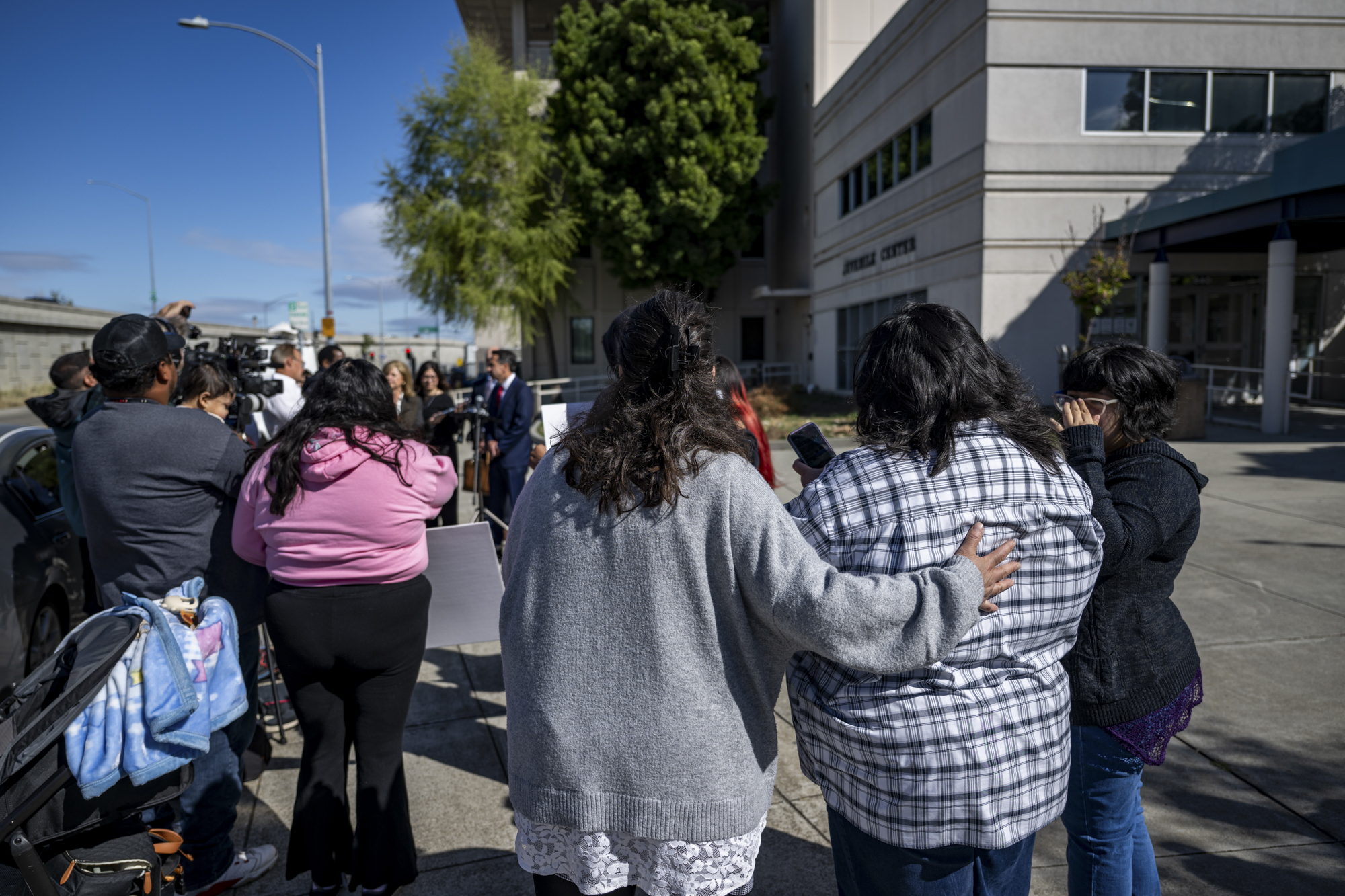 A crowd listens to District Attorney Jeff Rosen speak outside the Santa Clara County Juvenile Court in San José on April 20, 2026, where prosecutors announced charges against a San José teen accused of killing his two-year-old foster brother, Jaxon Juarez. (Beth LaBerge/KQED)