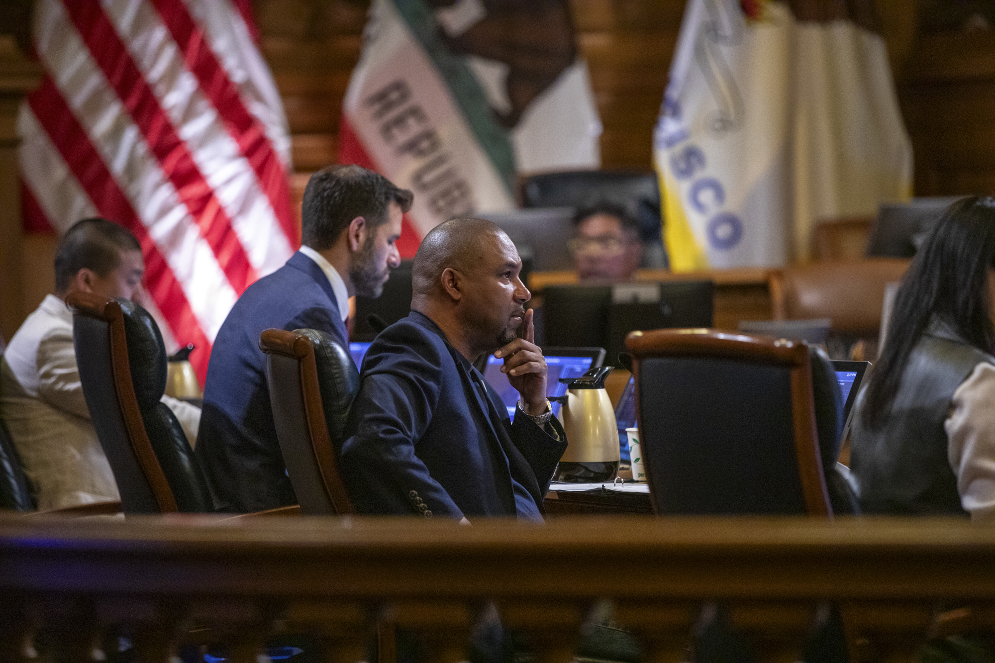 Supervisor Shamann Walton (center), representative of district 10, speaks at a meeting in the legislative chamber where city budgets are being discussed at San Francisco City Hall in San Francisco on April 22, 2026. (Tâm Vũ/KQED)