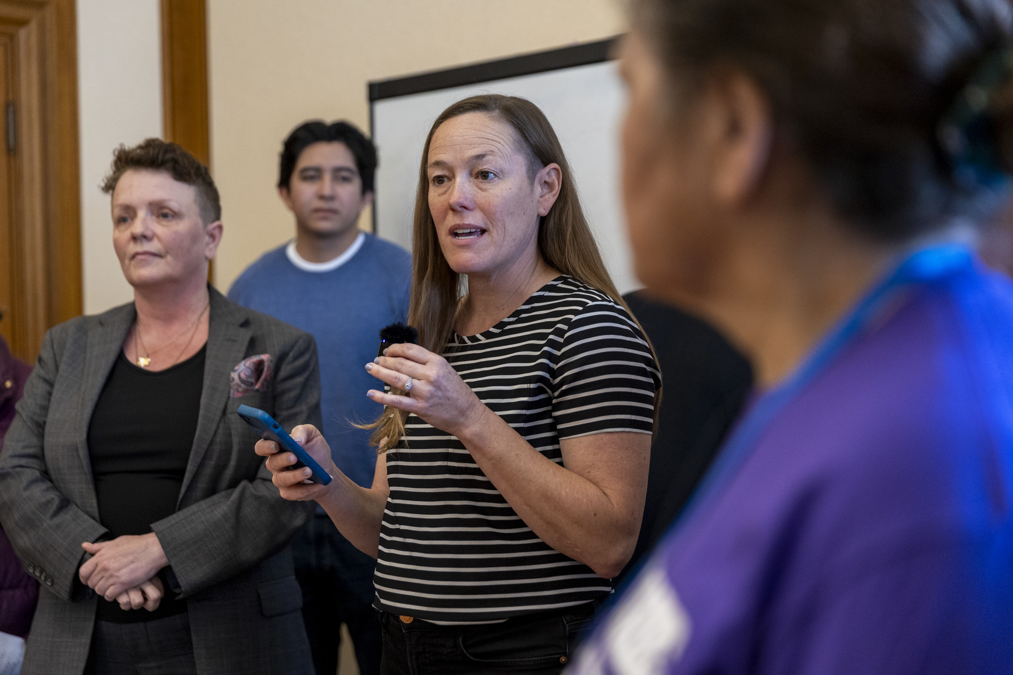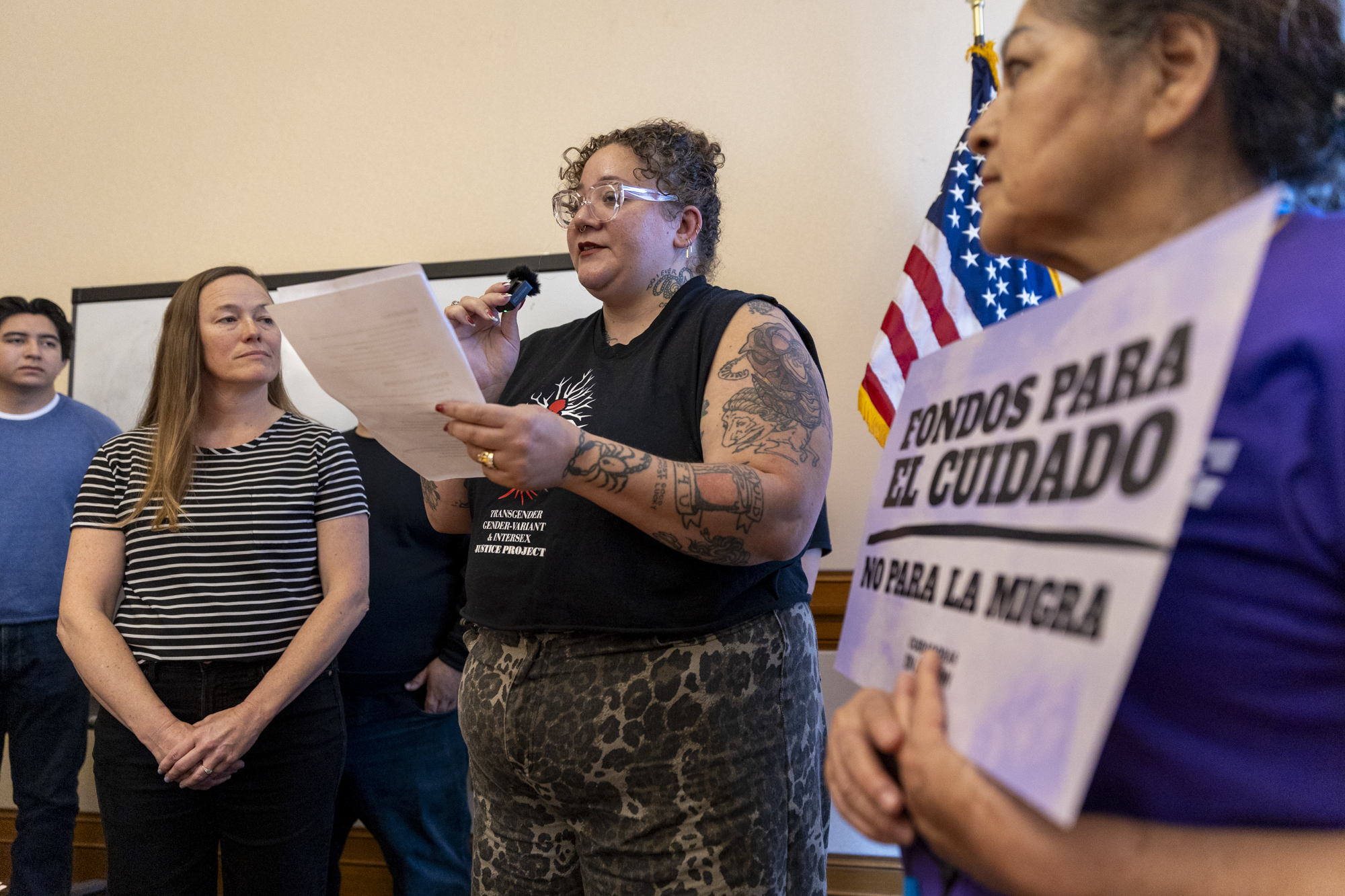 Rosemary Gardner, of the SF LGBT Center, speaks at a press conference hosted by SF People’s Budget Coalition, where community organizations speak out against major budget cuts to organizations that support low-income families at San Francisco City Hall in San Francisco on April 22, 2026. (Tâm Vũ/KQED)
