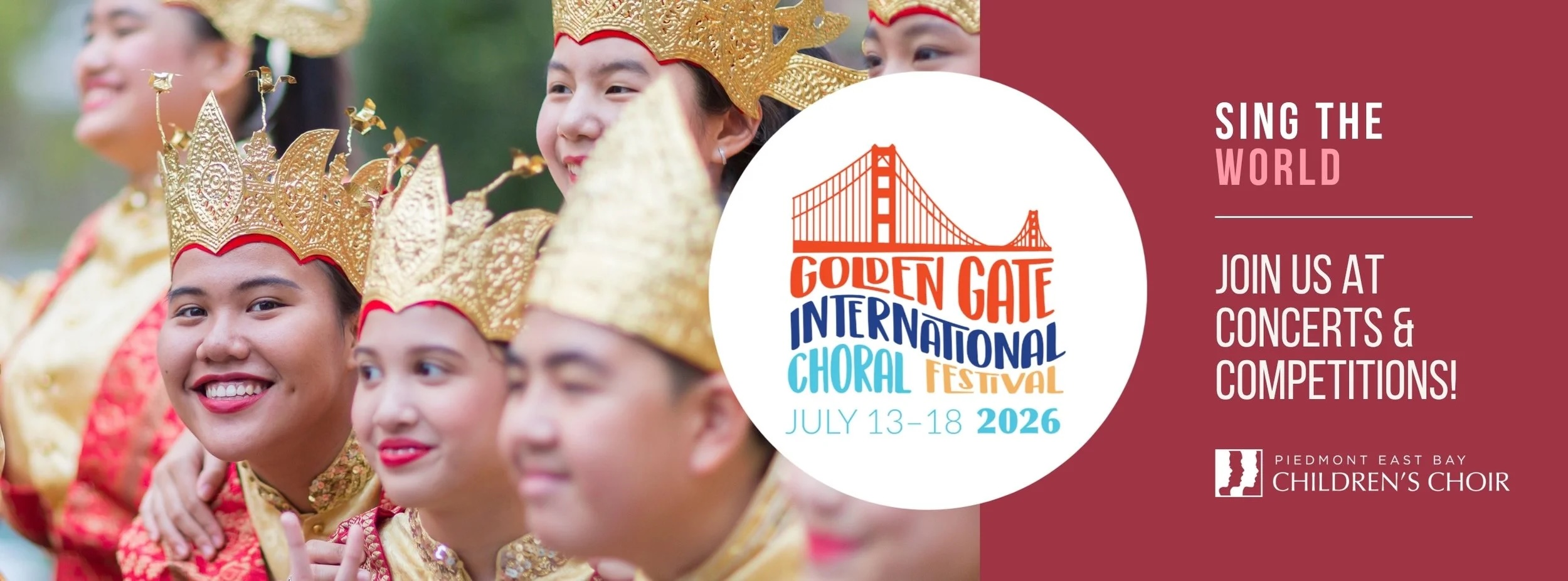 Experience the sound of the world this July at the 2026 Golden Gate International Children’s & Youth Choral Festival. Over the course of one remarkable week, more than 400 young singers from across Europe, Asia, and the United States will gather in the San Francisco Bay Area to share their artistry. Join us July 13-18 for a vibrant celebration of global youth in song!