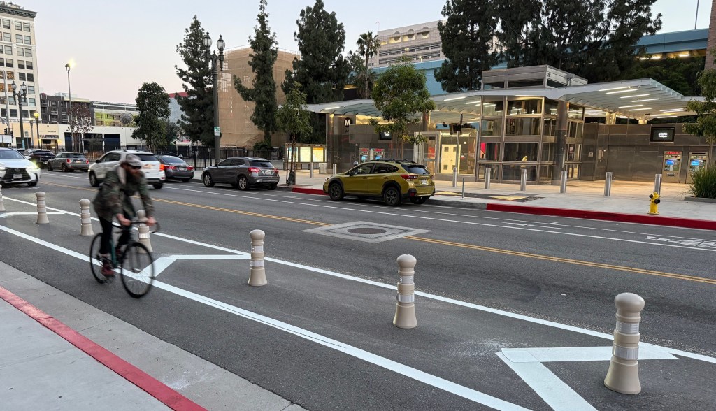Advocates pointed out that, in 2023, Metro and LADOT failed to follow city-approved downtown street standards (approved in 2009), favoring adding car capacity instead of first-last-mile (FLM) station connections. Metro and LADOT responded that they had to balance bike/walk station access with “parking and traffic maintenance” priorities, but would “identify opportunities for further FLM and mobility enhancements in the station areas.” It took three years, and now most of one block (of more than a dozen missing FLM facility blocks) of bikeway is completed.