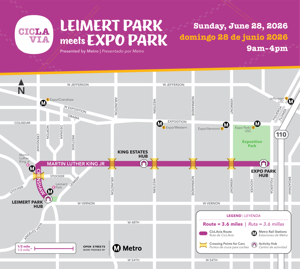 This week, CicLAvia shared the route map for the next CicLAvia event. CicLAvia will return to South L.A. on Sunday, June 28, with ‘Leimert Park meets Expo Park’ presented by Metro.