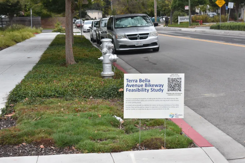 A sign advertises the Terra Bella bike lane project at the corner of Linda Vista and Terra Bella avenues. Photo by Zoe Morgan.