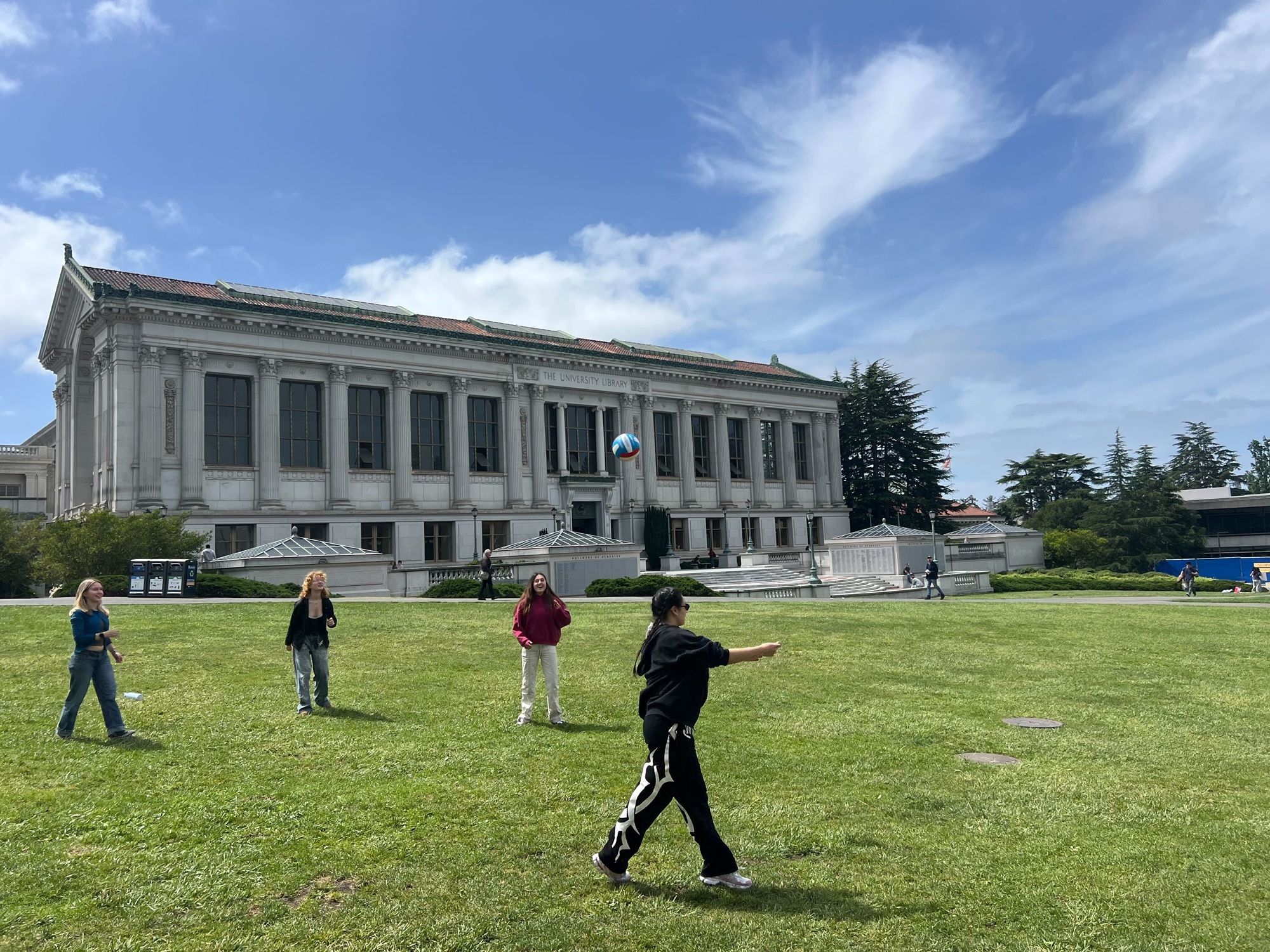 Students rally during a game of volleyball on the grass at a phone-free gathering at UC Berkeley on Friday, April 24, 2026. (Eliza Peppel/KQED)