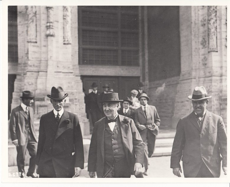 Thomas Edison (center) and Henry Ford (far left) at the Panama-Pacific Exposition in 1915. (Photo via Wikipedia/public domain)