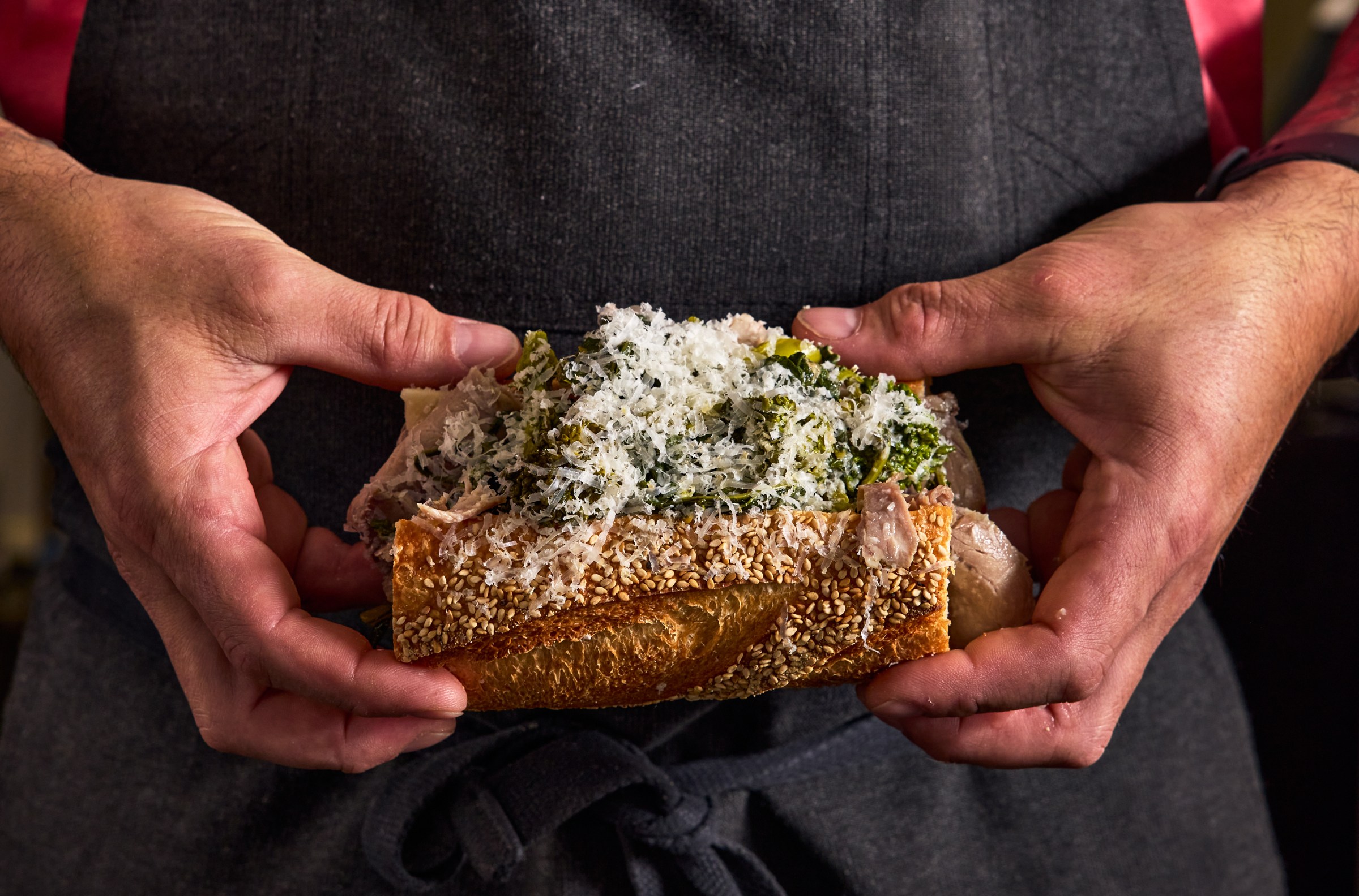 The sandwich will get a hit of broccoli pesto made by the team, followed by “crumbly, super sharp” provolone, that simmered pork, plus a broccoli raab-slash-broccolini combo roasted in garlic and olive oil, with a bit of red pepper flakes. “It’s a South Philly-Italian thing,” Kosoy says. “The bitter, spicy green compliments the savory, salty-sweet pork, and the super funky cheese, and it’s just always been that way for a very long time.”