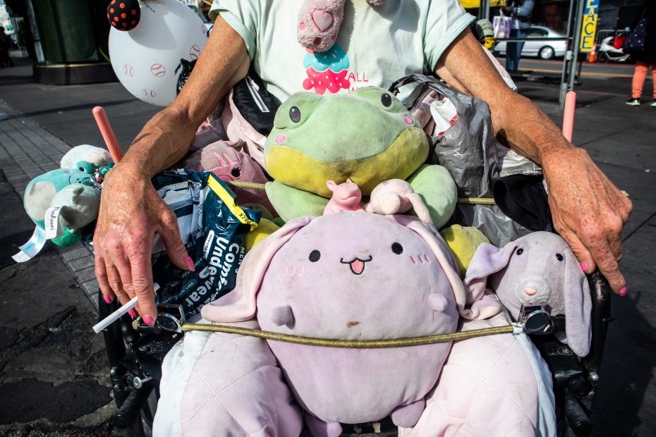 “I like big things. Big RVs, big men, big cakes,” Pinky said on Tuesday morning. Add to this: big stuffed animals. As he sat in a wheelchair on the 16th Street BART Plaza, at least eight were visible about his person, several strapped to his lap with a bungee cord. The rest of his collection, he said, he keeps in a storage unit, along with several musical instruments that he knows how to play, including a guitar and piano.