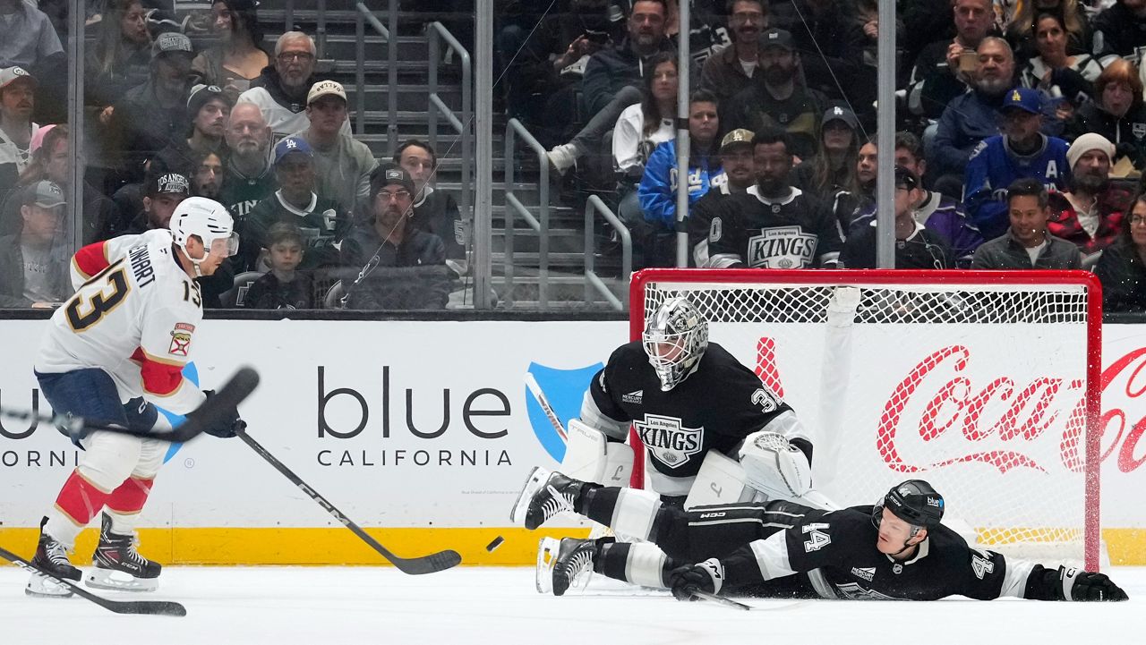Los Angeles Kings defenseman Mikey Anderson, right, dives in front of the shot of Florida Panthers center Sam Reinhart, left, as goaltender Anton Forsberg defends during the second period of Thursday’s NHL game in LA. (AP Photo/Mark J. Terrill)