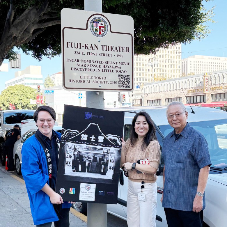 The sign, which bears the City of Los Angeles seal, reads: “Fuji-kan Theater, 324 E. First Street – 1925. Oscar-nominated silent movie star Sessue Hayakawa discovered in Little Tokyo. Little Tokyo Historical Society, 2025.”