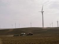 Windmills tower over farmland in Solano County on Dec. 26, 2023.