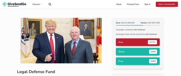 “I will never forget Dr. Eastman’s encouraging words to me as a charged 2020 Trump elector,” wrote Marian Sheridan, who donated $100 to Eastman, last month. “All lawfare charges against us were dismissed by a Democrat appointed judge on September 9th. I praise God for protecting us in the furnace and pray that doctor Eastman’s persecution ends soon.”