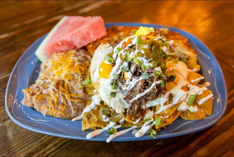 The Breakfast Club at Midtown’s verde chilaquiles comes with with braised beef on homemade corn tortilla chips tossed in a chili verde sauce, topped with eggs, cheese, sour cream, guacamole, Pico de Gallo and jalapeños. It’s served with potato of choice and housemade refried beans ($21). Courtesy The Breakfast Club at Midtown.