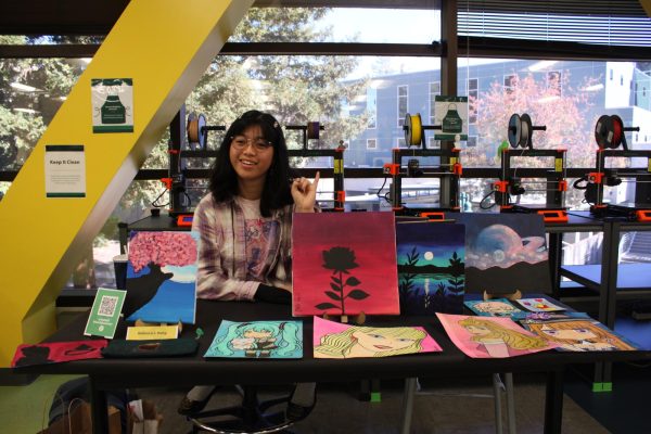 Aleks Retiro displays a wide variety of his artwork in the Makerspace Wednesday, Nov. 12, 2025. The Create, Make and Share Faire platforms creatives with a space to share their work, regardless of whether their work has been created within the Makerspace. (Photo by Giancarlo Diloy)