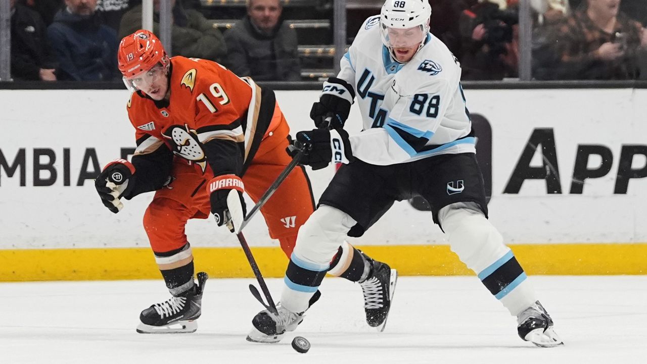 Utah Mammoth defenseman Nate Schmidt (88) battles Anaheim Ducks right wing Troy Terry, left, battle for position during the first period of Monday’s NHL game in Anaheim. (AP Photo/Gregory Bull)