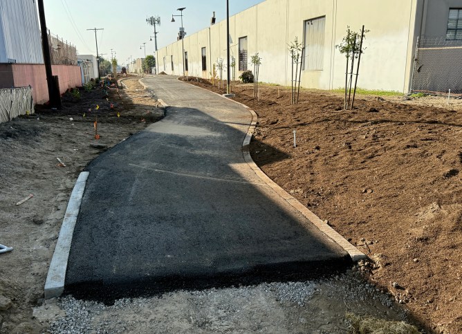 The Union Pacific trail is coming right along, as you can see. Paving is in, many of the trees are planted, and other design features are taking shape, so we can imagine in person just what it will be like when locals are moving on the trail west to Independence Park and east to Union Pacific Park.