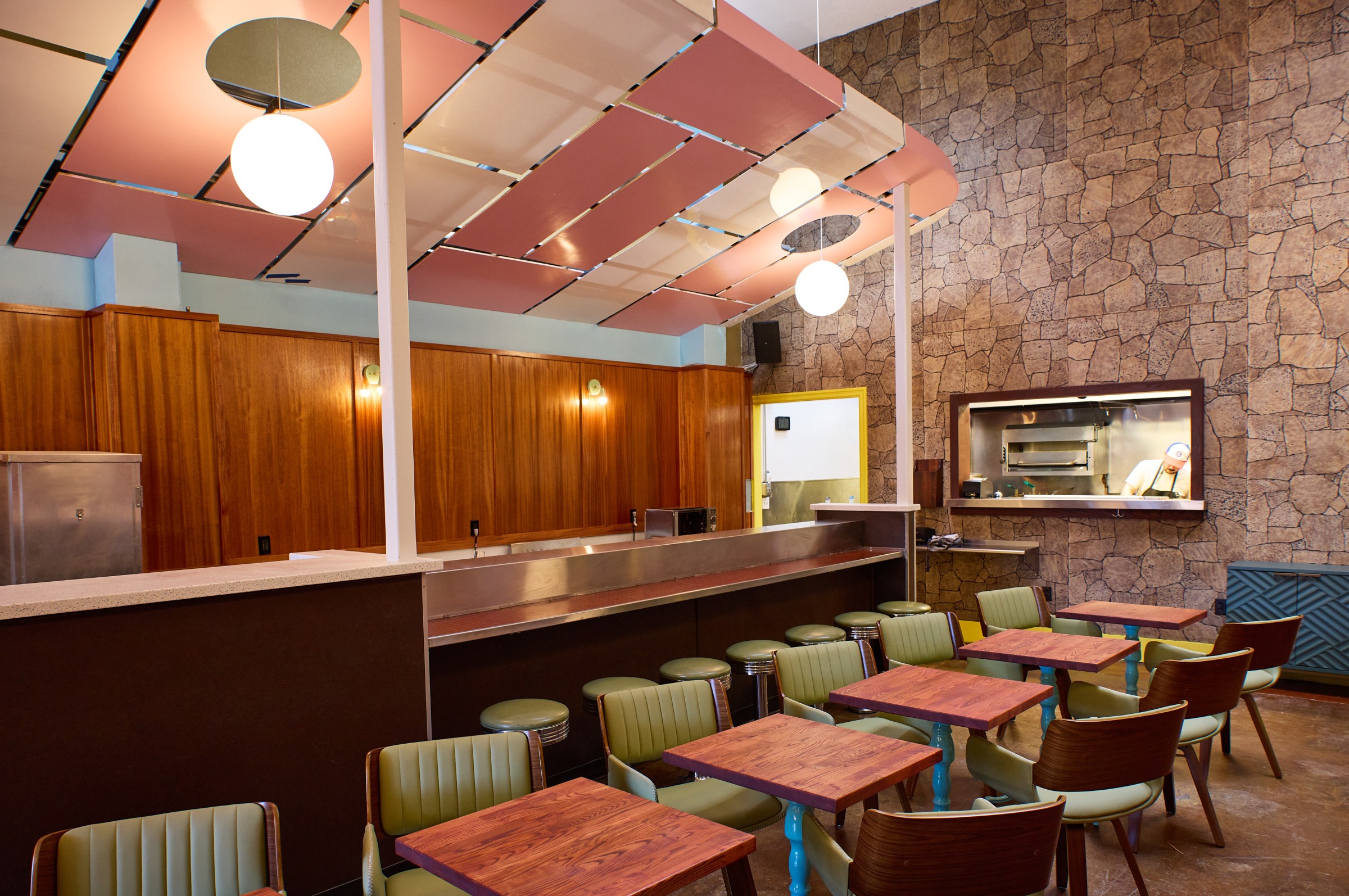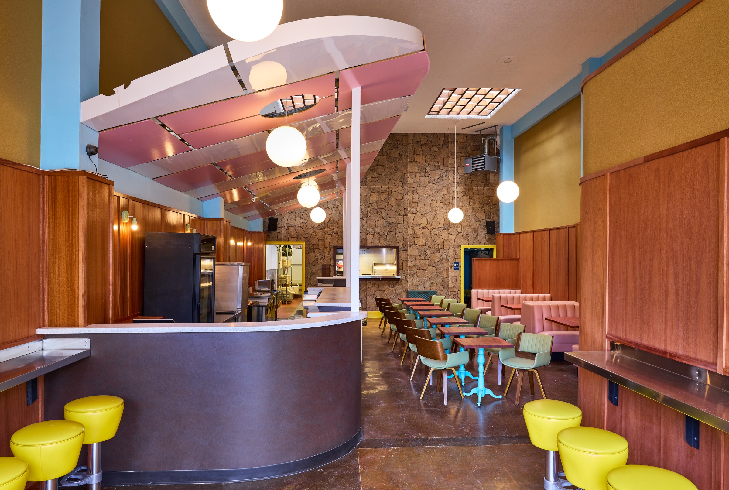 Those familiar with the space will see echoes of Wesburger in the new restaurant, such as the original wood, but Stowaway says it’s now lightened up with fun colors, like gold wallpaper, salmon pink booths, and terrazzo bar tops. (The bathrooms will also have their own moments with pink toilets and wild wallpaper, he adds.) It’s a modern diner with touches that keep things special, yet sentimental. “We just want it to be the most fun place where it’s the highest standard, but it’s the most accessible. I think that’s really, really important,” Stowaway says.
