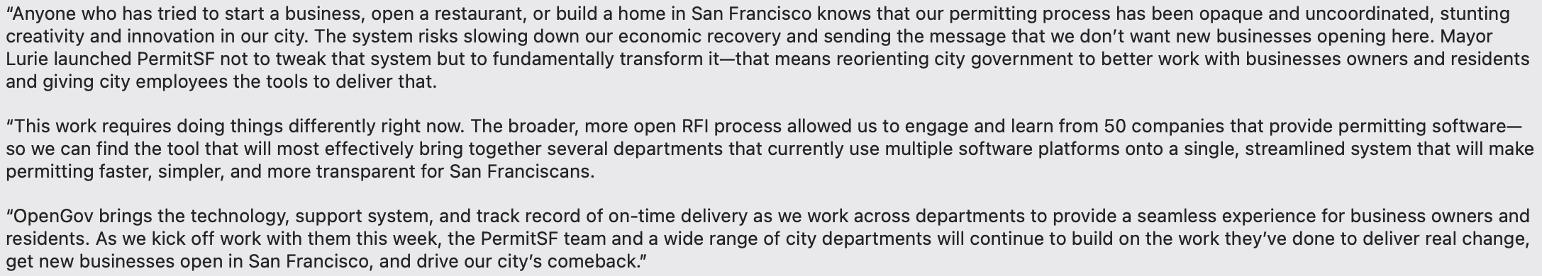 Multiple government hands were confused at how a large contract could be awarded through an RFI process. OpenGov’s contract is valued at $5.9 million and will take at least three years to fully implement, according to Sarah Bindman, product manager for PermitSF.