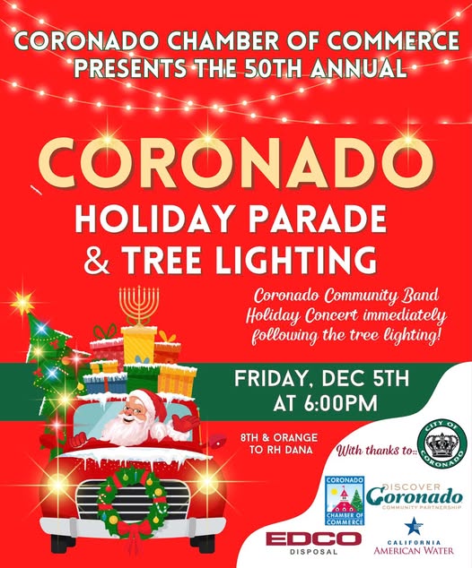“This is going to be the brightest parade yet!” Clancy promises. “Bring your neighbors, bring your friends, bring your kids, and come and enjoy downtown Coronado while the streets are closed. Wear your festive attire and make a night out of it.”