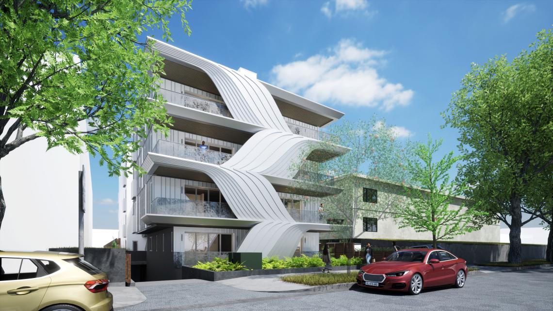 The project, designed by Tighe Architecture, consists of a four-story structure with 14 residential units above a subterranean parking garage with space for 20 vehicles. Plans call for 12 flats and two townhomes.