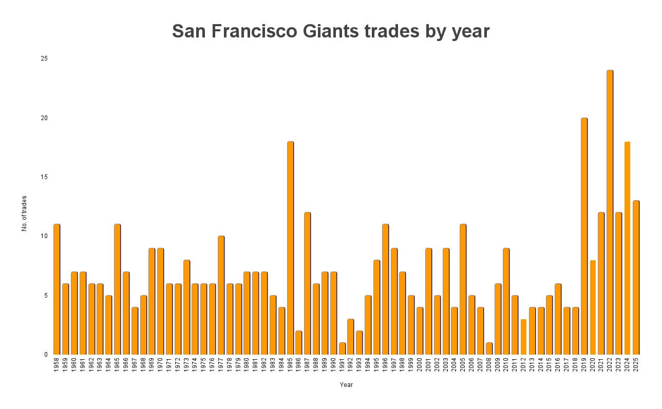 The Giants are currently making more trades than at any time in franchise history, and it didn’t stop when Farhan Zaidi left. My guess is that this trend would be similar for almost every team, if not all of them, but that’s just a guess. Consider that in 1958, a general manager would have to write trade ideas on little scrolls and tie them to the ankles of carrier pigeons, but in 2025, they can spam each other with texts until they get blocked or get something done. It’s a transactional world out there.