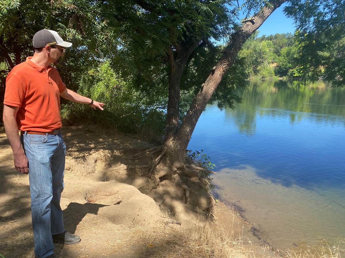 Hans Carota, one of the lead engineers on the proposed levee project points out erosion at a popular swimming hole on the south bank of the American River near Larchmont Park. June 17, 2025.Sally Longenecker/CapRadio