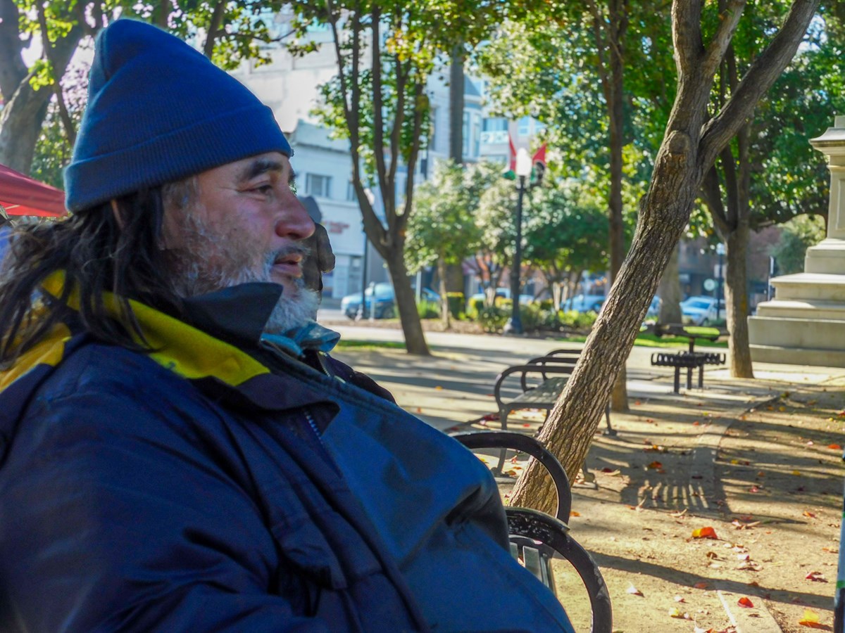 Enrique Espinoza sits on a bench at César Chávez Plaza on Tuesday, Dec. 2, 2025. Espinoza said he often avoids weather-respite centers due to overcrowding and instead builds his own insulation to stay warm at night.(Kai Arellano/CapRadio)