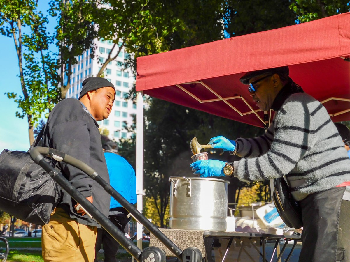 Ken Diggs ladles soup for a man waiting in line at César Chávez Plaza on Tuesday, Dec. 2, 2025. Diggs says he tries to offer warm meals when winter storms move through Sacramento.(Kai Arellano/CapRadio)