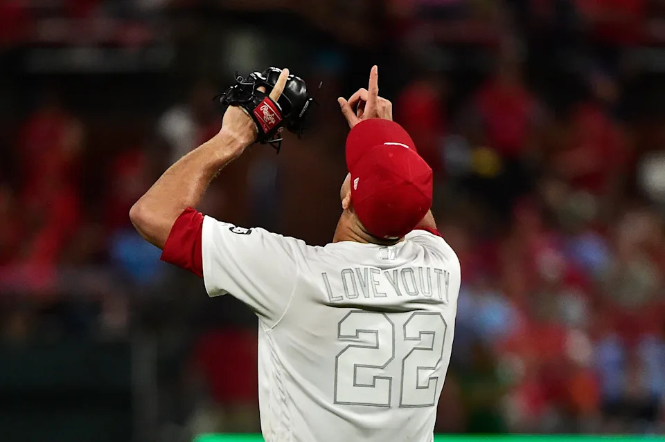 St. Louis Cardinals starting pitcher Jack Flaherty (22) points to the sky prior to pitching in the sixth inning against the Colorado Rockies during an MLB Players’ Weekend game at Busch Stadium on Aug. 23, 2019. FlahertyÕs jersey nickname and cleats honored his friend Tyler Skaggs who passed away earlier the season.