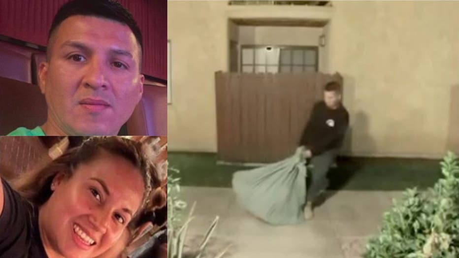August 13, 2025: Surveillance video captured her husband dragging a large object wrapped in fabric from the apartment complex.