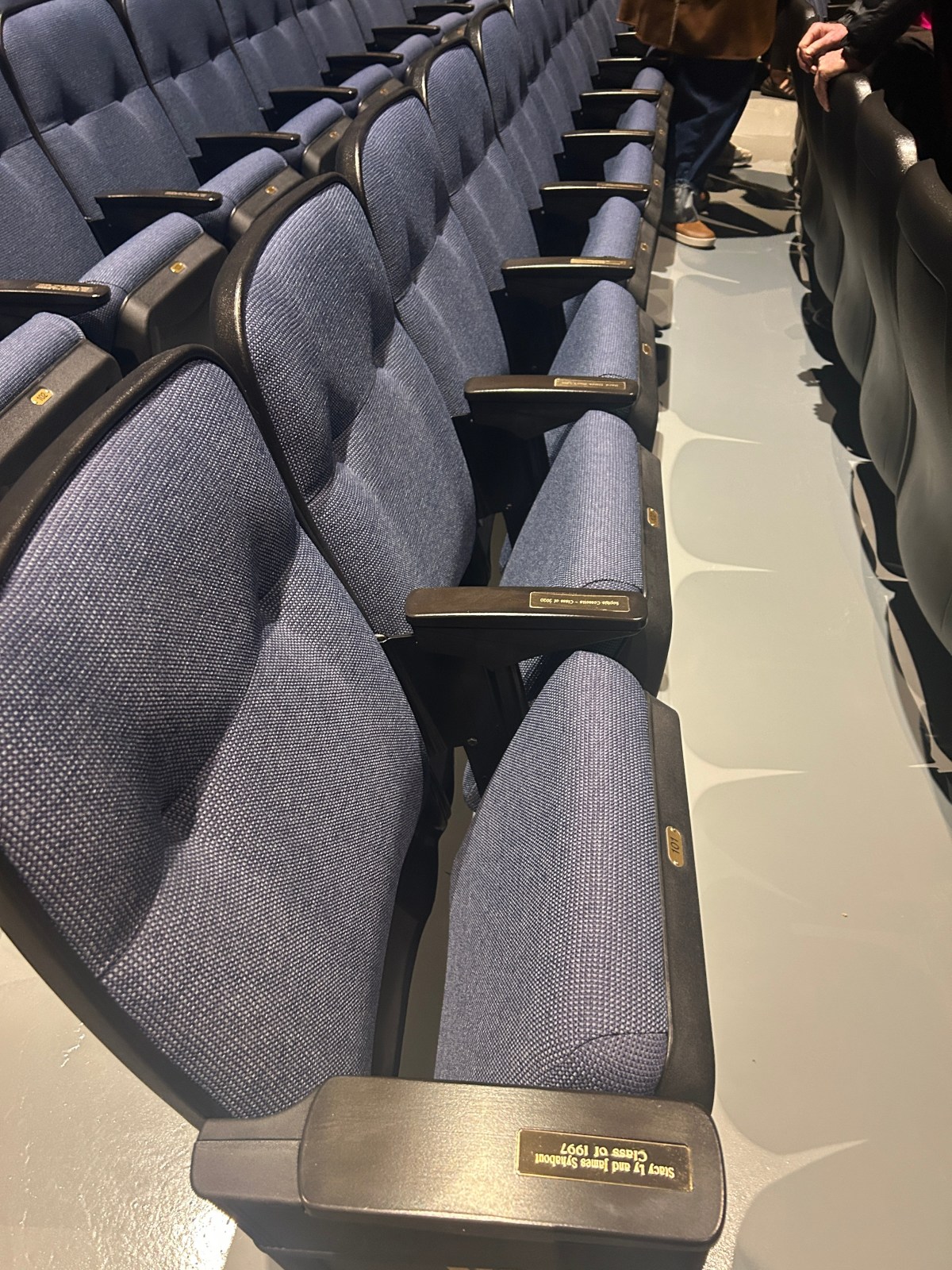Seats in the Oakland Tech auditorium are engraved with messages from alumni. Credit: Ashley McBride/The Oaklandside