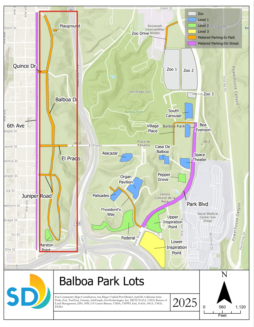 Well, come Jan. 5, those days are over, since, if they want to park for free when they work, they will be relegated to Tier 2 and 3 lots, as well as metered spots on roads within the park’s West Mesa (see red box in map below), which are the spots in the park south of Upas, west of SR-163 and north of I-5. So, basically, Balboa Drive, 8th Avenue and all the side streets and lots that are inside the park’s border.