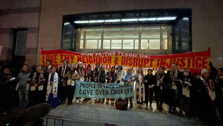 SAN FRANCISCO – More than 100 people from Bay Area faith communities locked arms outside ICE’s San Francisco Field Office Tuesday morning in an effort that they described as trying to “stop ICE from kidnapping community members” at their immigration check-ins.