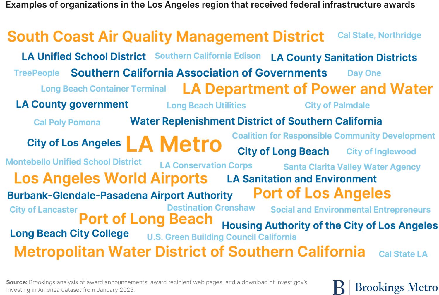 Local and regional organizations in the Los Angeles area received $5.9 billion in awards via 274 grants. Grants came from multiple federal departments, including the departments of Transportation, Energy, Interior, and Agriculture as well as the Environmental Protection Agency and the National Oceanic and Atmospheric Administration.