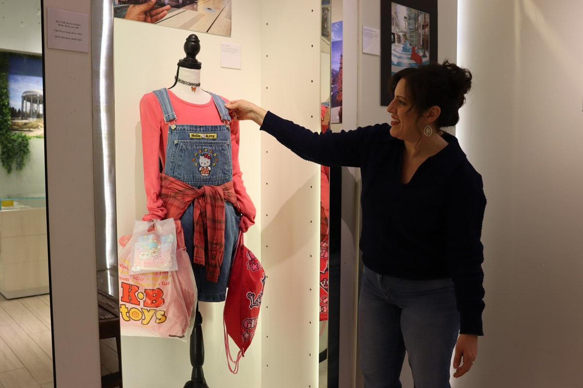 Sarah Mejia adjusts a vintage KB Toys shopping bag on a mannequin inside the Sacramento Rewind exhibit at Arden Fair Mall on Friday, Dec. 12, 2025.Tony Rodriguez/CapRadio