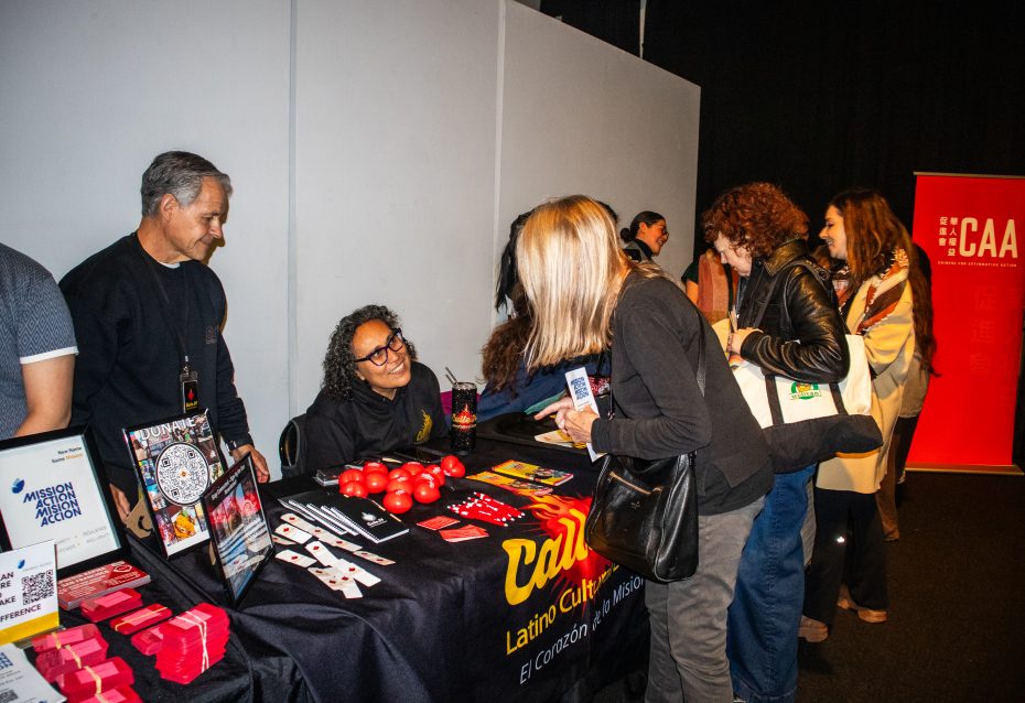 Immigrant advocacy groups table Mission Local’s event on Dec. 16, 2025. Photo by Abigail Van Neely.