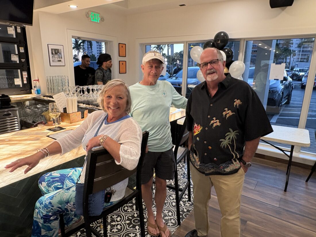 Sue Anderson (left to right), Bob Anderson and Ray Murphy enjoy the soft opening at Legno Italian Kitchen on Fort Myers Beach. Photo by Nathan Mayberg