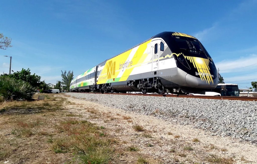A brightline train sits on the platform