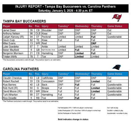 Fun facts: The Stinking Panthers have not won a game they were favored in this season. The Bucs are a 2.5-point favorite per Hard Rock Bet. QB Bryce Young has a touchdown pass in five of his last six games. RB Rico Dowdle has 1,066 yards rushing. … WR Tetairoa McMillan has a touchdown catch in 2 of his past 3 road games. … DT Derrick Brown has six tackles last week. CB Mike Jackson led Carolina with 11 tackles last week and had two passes defensed and a pick. He has a pass defensed in seven straight games, longest streak of the season. He leads the NFL with 19 passes defensed. … Bucs QB Baker Mayfield passed for 346 yards and two touchdowns last week at Miami. He has a touchdown pass in 15 of his last 16 games. … RB Rachaad White has 60+ scrimmage yards in four of his last five games against Carolina. … In his last three games against Carolina, WR Mike Evans has a touchdown catch. … OLB YaYa Diaby had a season-high 6 tackles, 2 tackles for loss and a sack in Miami. ILB Lavonte David had 10 tackles and a sack two weeks ago against Carolina. … S Antoine Winfield co-led Bucs with 7 tackles last week. He has at least seven tackles in two of his past three games.