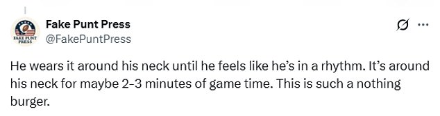 One fan said: ‘He wears it around his neck until he feels like he’s in a rhythm. It’s around his neck for maybe 2-3 minutes of game time. This is such a nothing burger’.Â