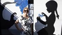 Bonnie Ruffin poses with her paintings at the Coconut Point New Year’s Art Festival on Dec. 28. The Port St. Lucie artist said economic uncertainty has made some buyers more cautious, even as interest in local art remains steady.