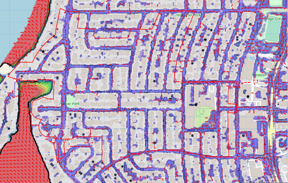 The 95-page report stops short of a formal recommendation — that’s for a later phase. But it  does discuss in intricate complexity — with charts and algebraic equations — the mechanism of  how streets actually flood in major rain events. It stresses that rainwater just doesn’t fall — it  moves in currents up, down, and crossways across island streets, and is pressured by tidal forces. These patterns and loops can reverse themselves during the day as tide levels change and create “micro-basins” that can be up to 3 feet deep.