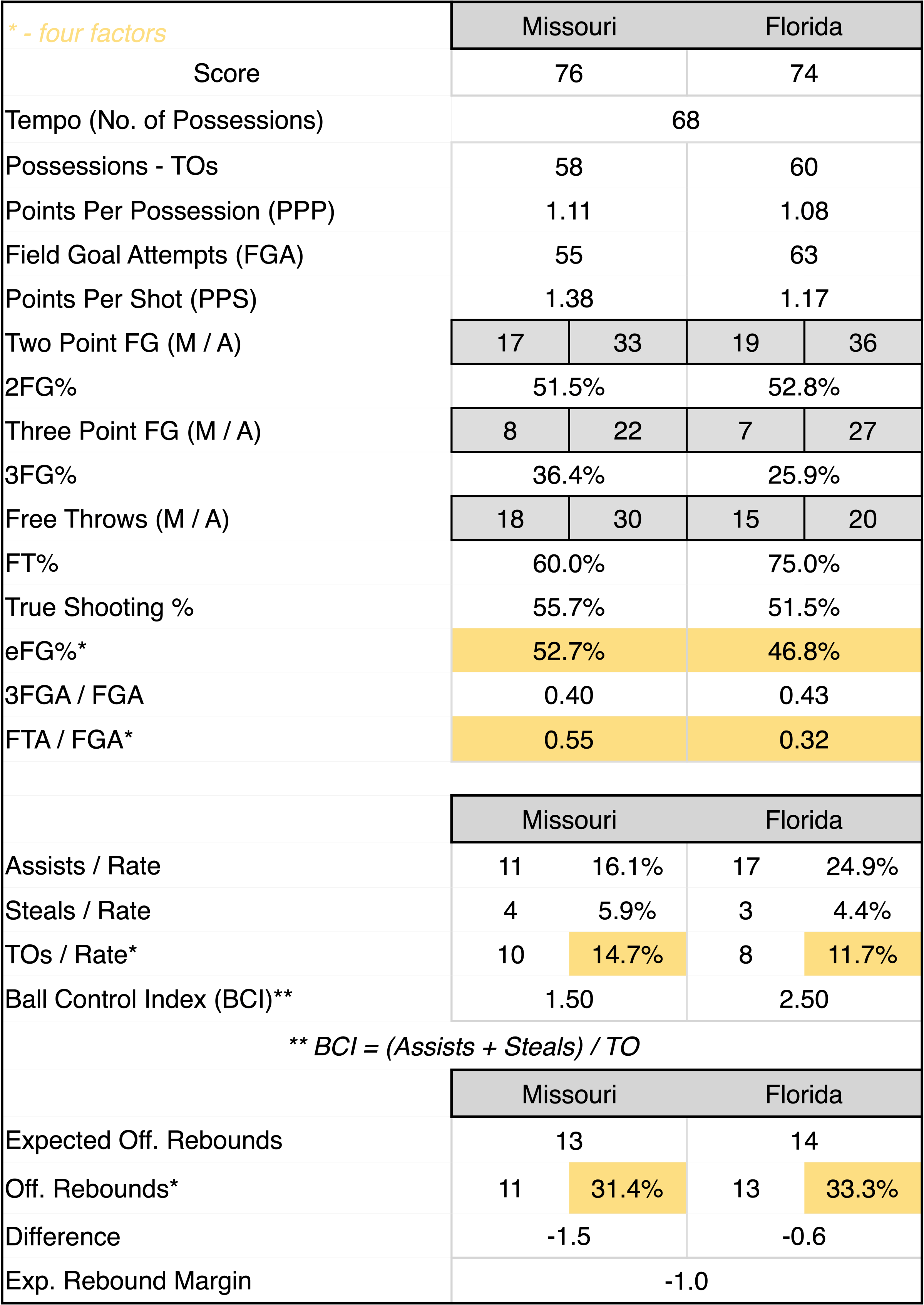 On the season Florida collects almost 44% of their misses, and Missouri held them 11% below that season average. The Gators also rebound 76.6% of the available defensive rebounds, so Missouri’s 31.4% ORB% was around 8% better than the Gators normally give up. So while Mizzou lost the expected rebounding advantage by 1, they really negated one of Florida’s biggest strengths by playing equal. Or close to it. The raw rebounding numbers were even. In the last two years the Gators have lost or tied the rebounding battle 9 times, they’ve only lost two of those games… well now three.