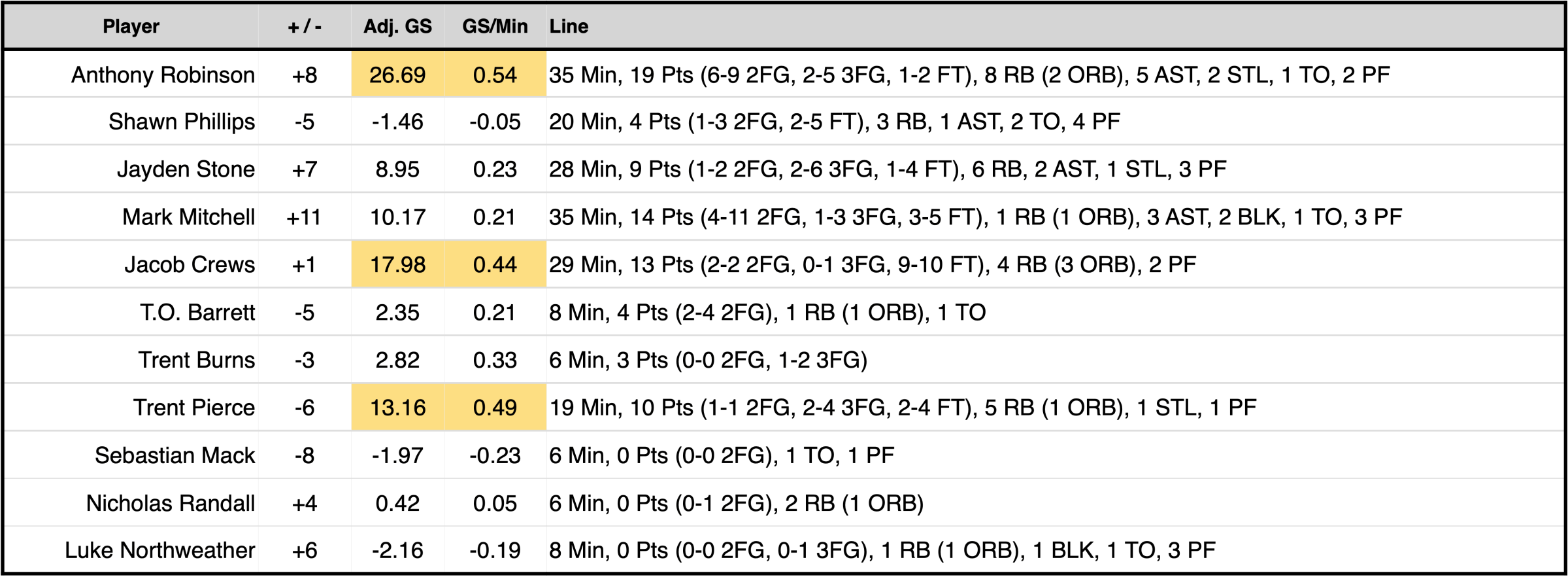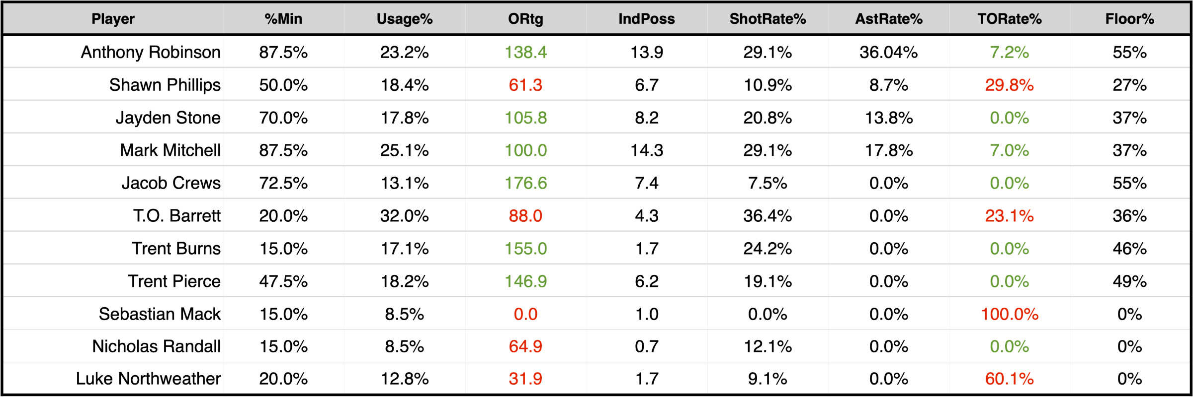 The rest of the transfer class had a pretty tough night, Phillips had a -1.46 game score, Sebastian Mack was -1.97, and Northweather was -2.16. Missing shots, fouling, turning the ball over.