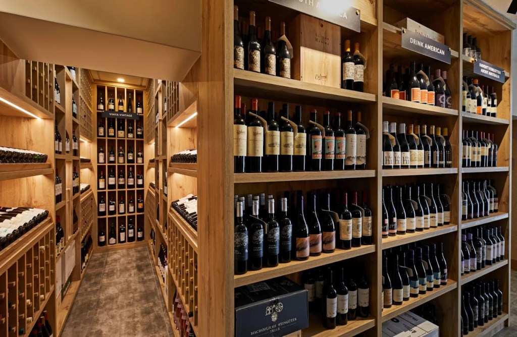 The space combined dining, a full bar, and a retail wall, allowing guests to select bottles from the shelves to drink on-site or take home