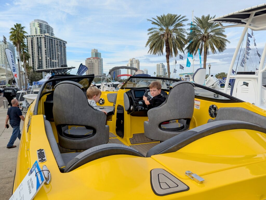 Two siblings seize an opportunity to climb into a new speedboat at the 2025 show.