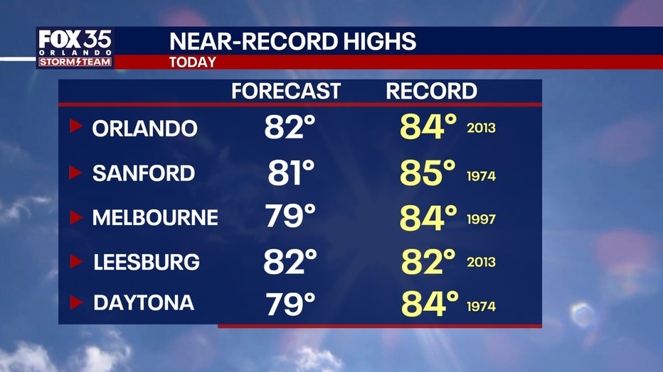 We’ll likely come close to a few records in some places around Central Florida. Orlando will warm to a high of 82°, which is just a few degrees shy of the previous record of 84° set back in 2013.