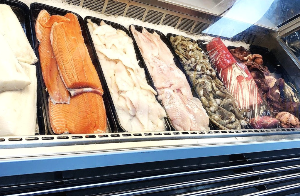The retail case stocks a variety of fish, including snapper, salmon, grouper, mahi mahi, corvina, octopus, and stone crab.