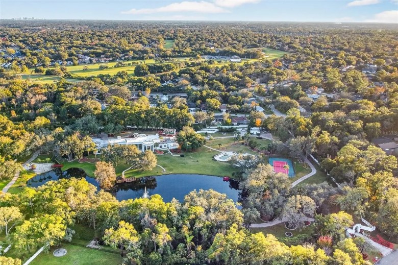 It offers nine bedrooms, 13 bathrooms and spans a total 14,623 square feet. The home is set on nearly 12 acres and the property centers around a 5-acre private lake spring fed by Wekiva Springs State Park. The exterior is sprinkled with imported European fountains, bronze sculptures and koi fish ponds.