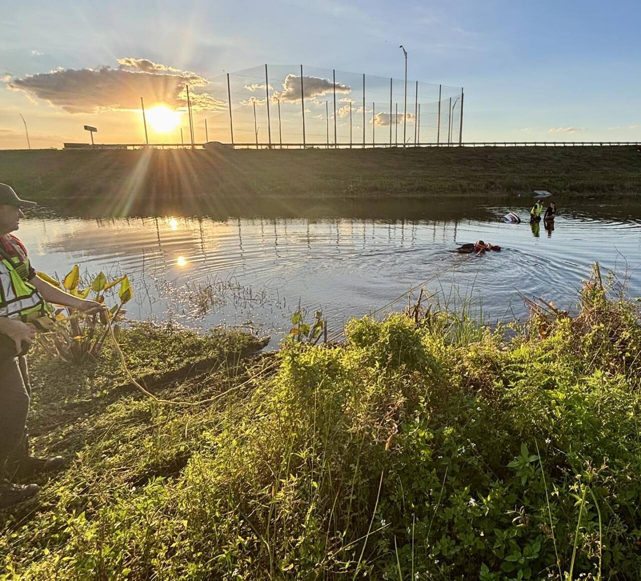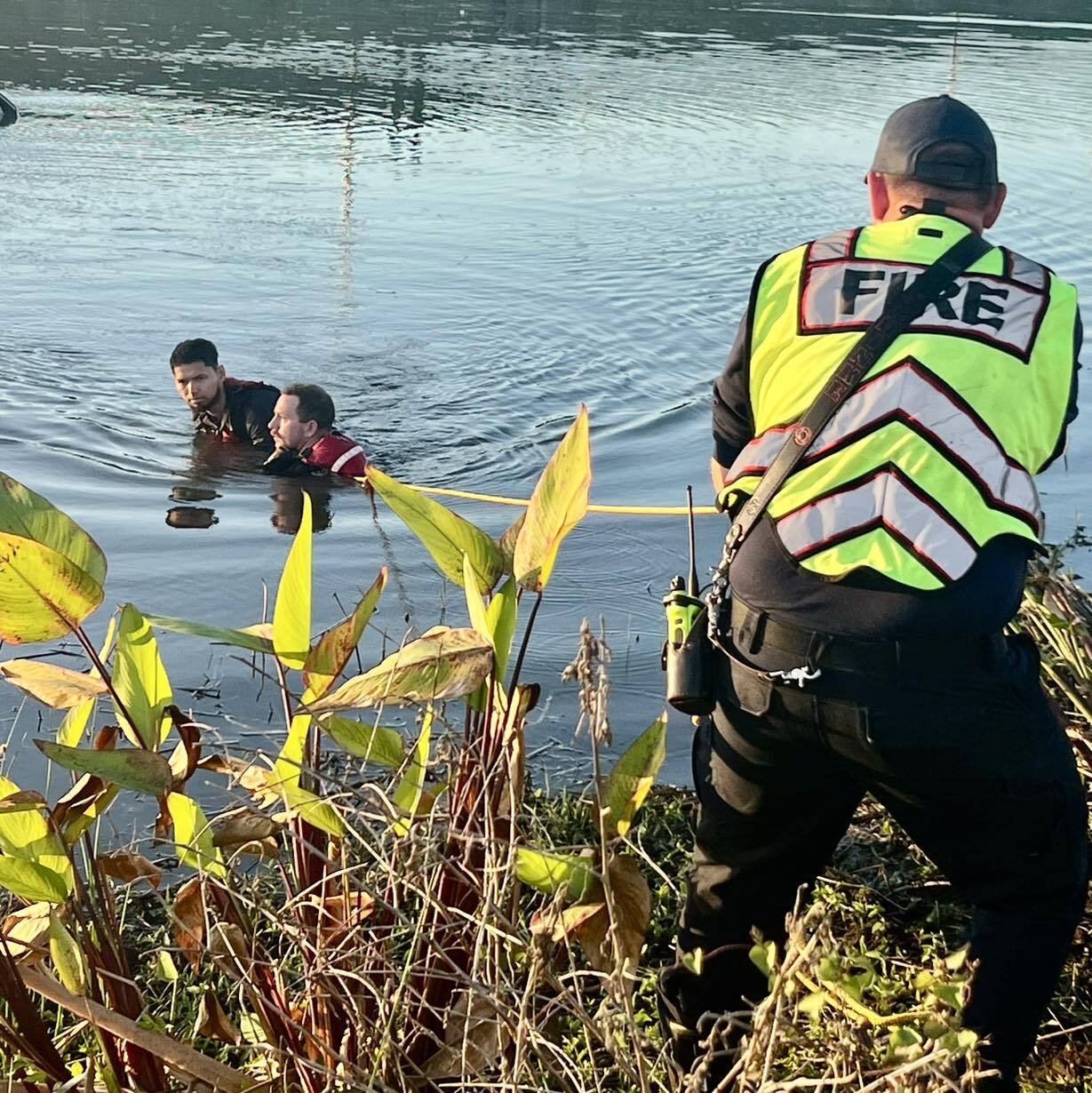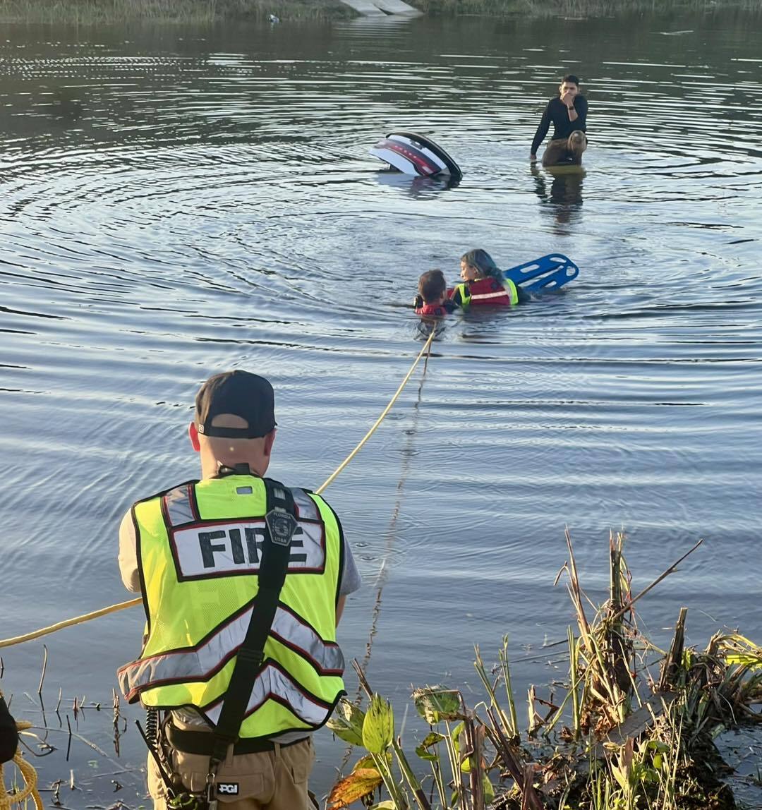 South Trail Fire Rescue said it responded to the single-vehicle crash around 5:04 p.m. Both occupants managed to escape the sinking car and climbed on top of the vehicle while it remained partially submerged in the water.